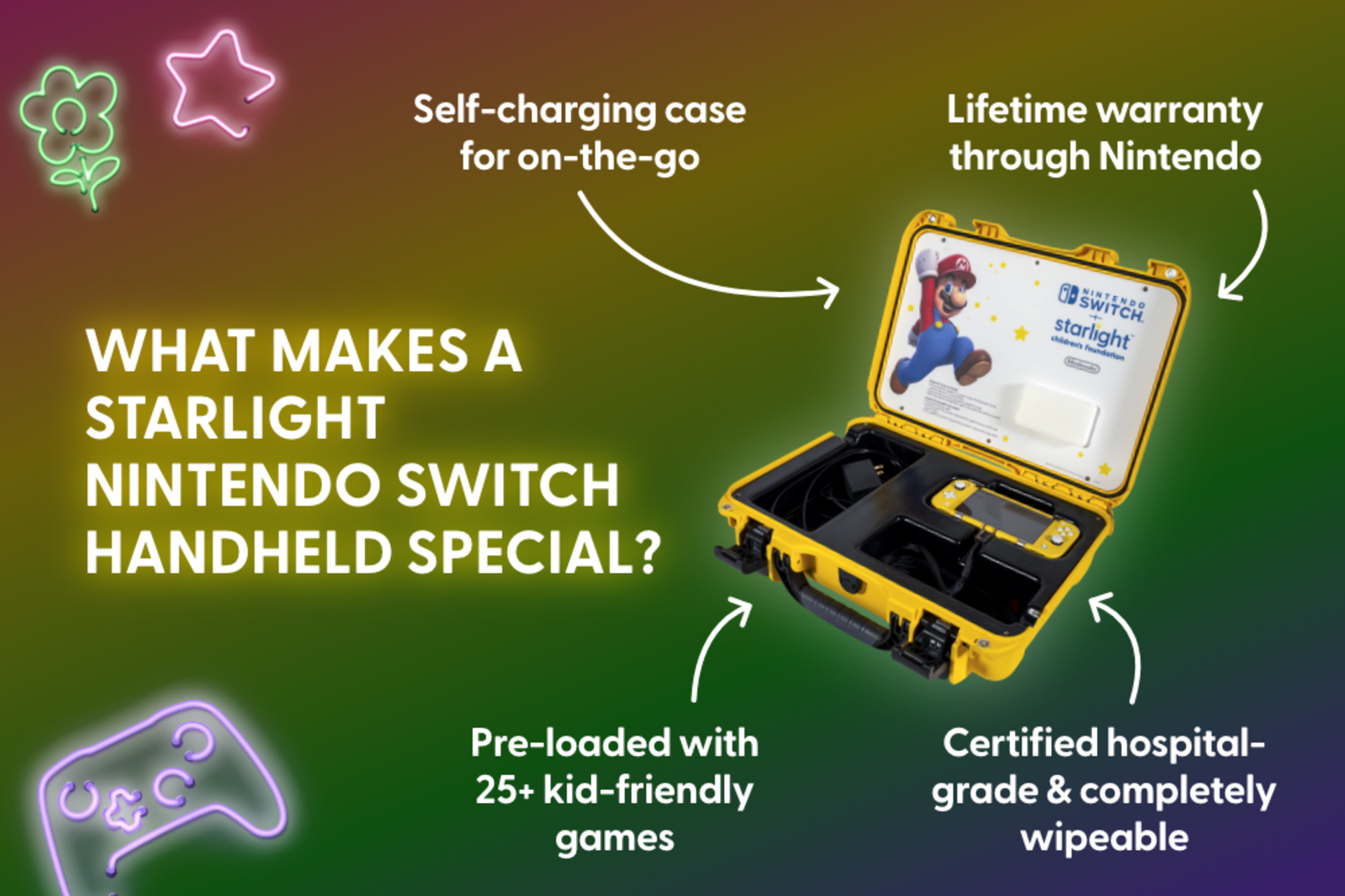 Because of the amazing support, and a generous anonymous matching gift, we’ll be delivering over 100 Starlight Nintendo Switch Handhelds to hospitals across the country, with more than half going to hospitals with medically underserved populations. We are truly in awe of our amazing community and its dedication to delivering happiness to hospitalized kids!